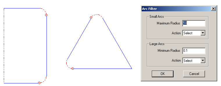 ARC FILTER, also an Edit feature, displays all arcs that are either larger or smaller that the Maximum Radius and Minimum Radius. Arcs that are not within the users specified parameters are displayed as dashed red lines, and can now be edited. If the identified arc is very tiny a red node point may be the clue that there is a tiny arc.