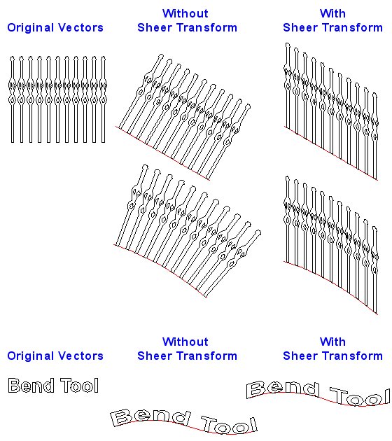 The BEND TOOL has a new feature, Sheer Transform. This feature doubles the flexibility of the Bend tool by forcing vectors that were originally vertical to remain vertical. Without Sheer Transform vectors angle along the path of the selected line or arc. The Bend Tool Dialog now has a picture that illustrates how the selected options will affect the bend tool results.