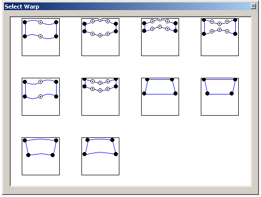WARP deforms selected polylines according to transformations defined by pre-designed shapes. These shapes represent the result of transforming a rectangle. This powerful tool gives users the power to create unique designs quickly, with just a few mouse clicks. Double left click to see the selection of shapes available, click on the desired Warp pattern, then draw a box around vectors that you want to warp.